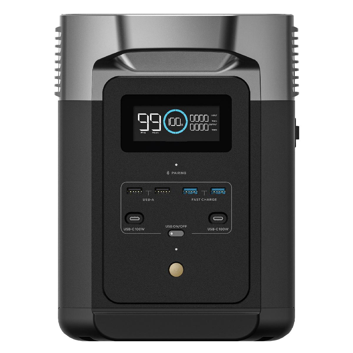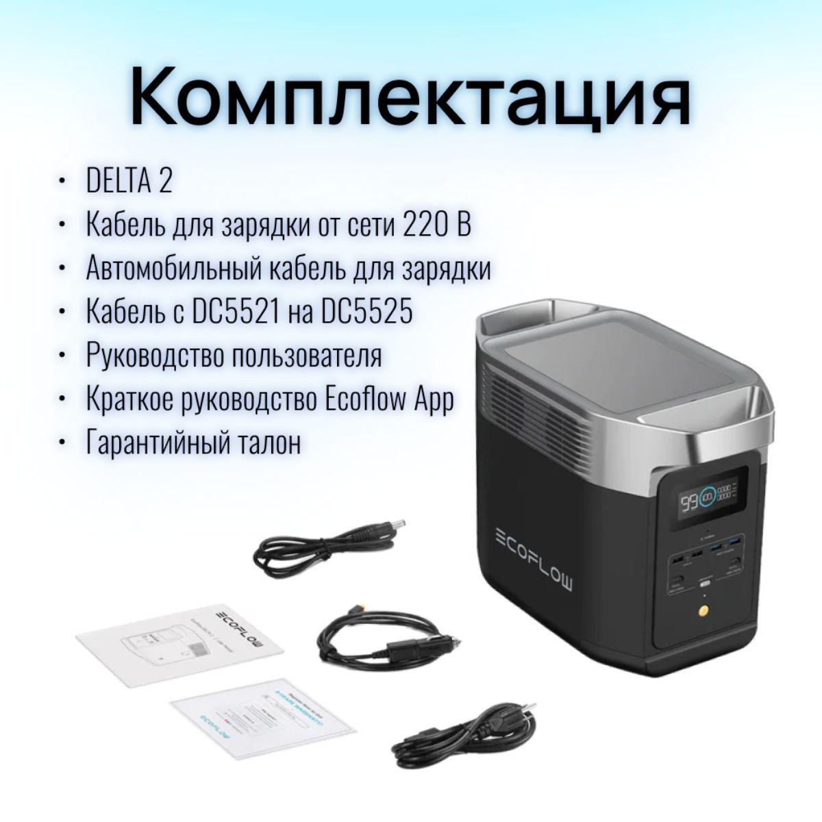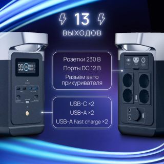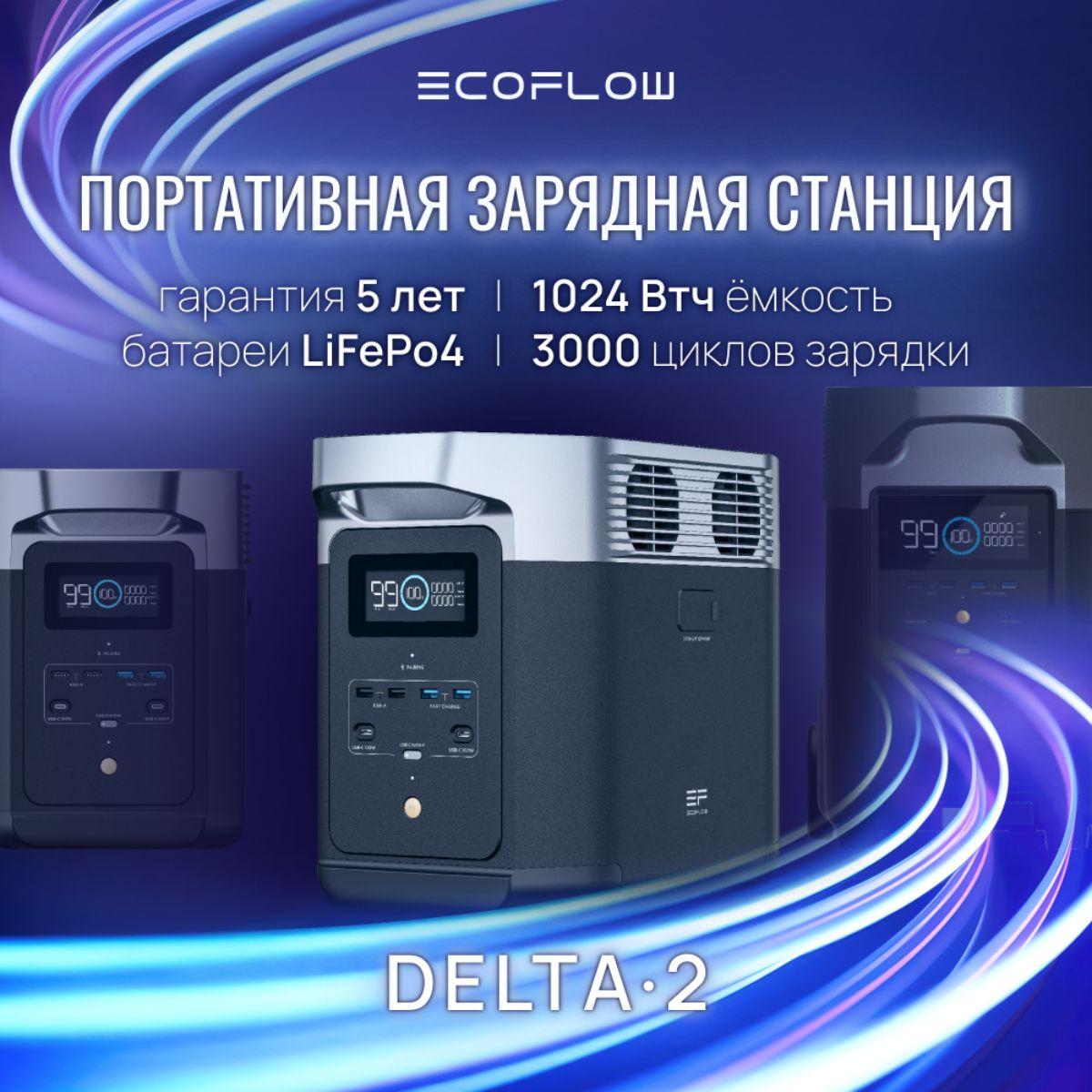 Портативная зарядная электростанция EcoFlow DELTA 2 с расширяемой емкостью 1–3 кВт⋅ч (за счет дополнительной батареи, приобретаемой отдельно или в специальном комплекте).