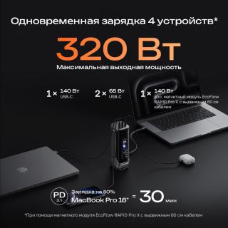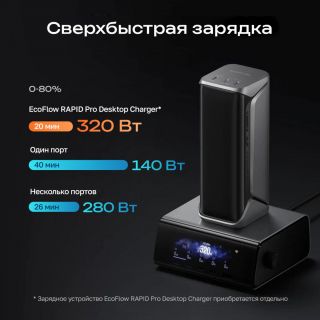 - Быстрая зарядка всего 20 минут до 80% с зарядной станцией EcoFlow RAPID Pro 320 Вт