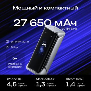 - Компактный размер, мощная производительность аккумулятор 27 650 мАч (99,54 Втч) – разрешено брать в самолёт